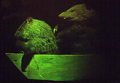 One starry night, a groundhog and a possum ride in a small boat through gentle sea waves.