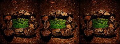 An interactive holographic installation featuring a white-light reflection hologram beneath a small pool of water, set into a frame of broken asphalt. When viewed from a distance, it appears to be a misplaced pot-hole, and the sounds of a street are heard. Moving closer, and peering into this pot-hole, a holographic image of a frog and a stream bed suddenly appears. At the same time, a motion sensor positioned near the hologram detects the viewer and triggers digital electronics to replace the urban sounds with those of a stream. Moving away from the installation, the image vanishes, and the street sounds return.