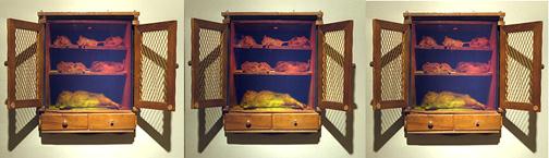Rodent Shelf The small cupboard contains the holographic images of three mice, two voles, and a rat.